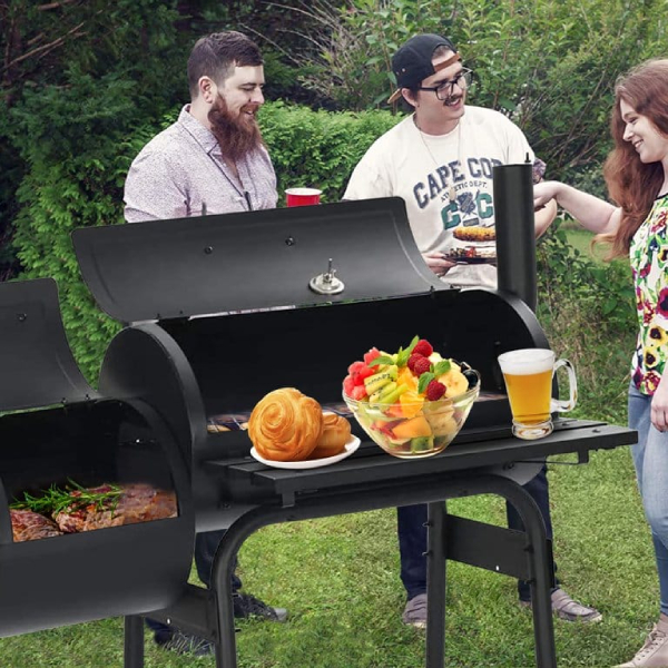 It features a side shelf that can hold food and tools for added convenience. The backyard charcoal grill has a sleek and stylish black design that will look impressive during use and match most outdoor decors. It also has wheels on the bottom to help transport when needed.