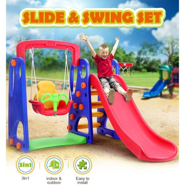 This is a wonderful multifunctional 3in1 outdoor playground which comes with swing, slide and basketball hoop, and it will give your kids great fun.