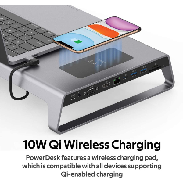 Convert your laptop into an ultimate working station using the USB-C multi-function laptop stand. PowerDesk boasts a powerful 10W Qi wireless charging pad with 87W USB-C Power Delivery. The laptop charging stand also features VGA and 4K HDMI ports, so that you can connect monitor, TV, or projector with ease.