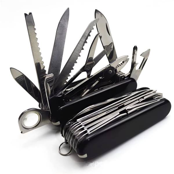 Including knifes, screwdrivers, bottle opener, scissors, pliers, tweezers, saw, file, key ring functions, etc.