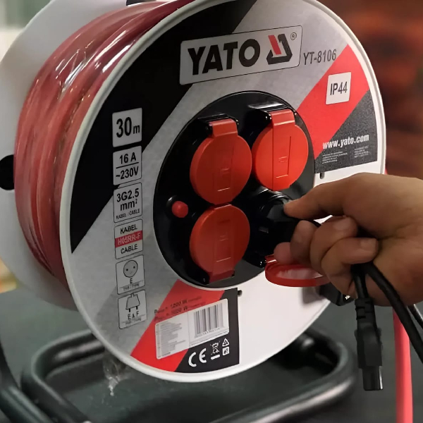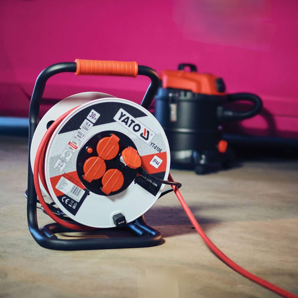 Building and workshop extension cable reel YT-8106 with a length of 30 meters with 4 dust- and splash-proof sockets, thermal protection and child protection. Natural rubber sheathed cable wound on a drum made of durable plastic makes the extension cord suitable for indoor as well as outdoor use, such as on construction sites, in gardens, in yards in front of factories.