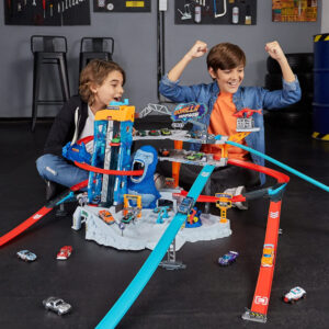 INTERACTION FUN: Manually operated 2-car elevator. As one car is lifted up to the second or third flood, the second elevator lowers your car to the ground. On the first floor use the repair stations to fix your cars or show them off on the spinning gorilla arm. When things get dangerous us the rescue helicopter to bring your metal machines to safety.